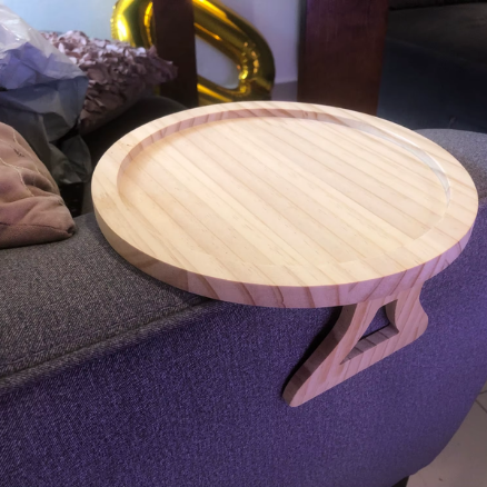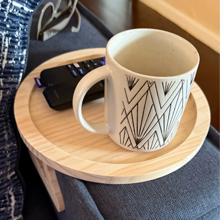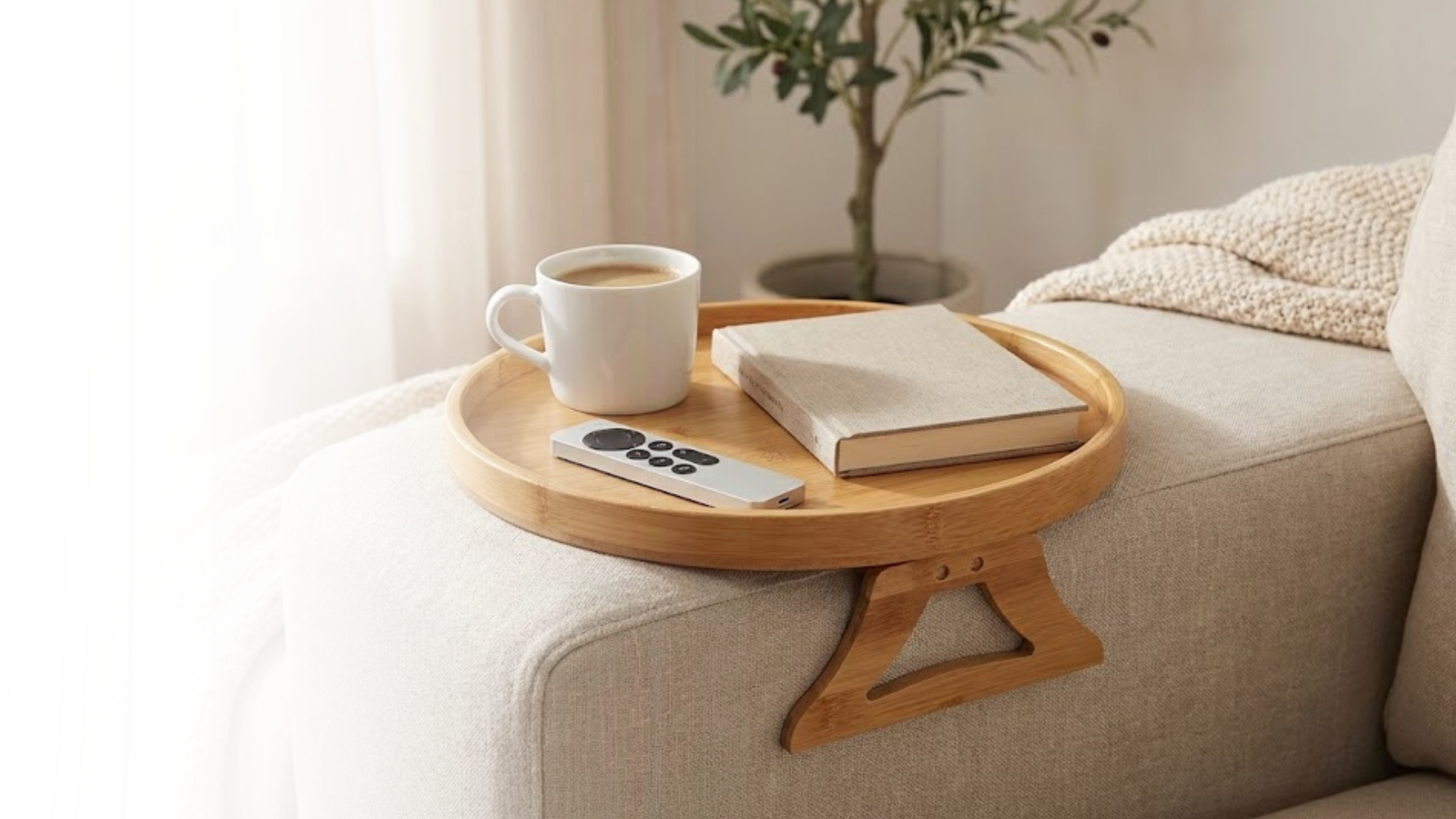 A Softray encaixa no braço do sofá e cria uma superfície estável para café, celular e controle.